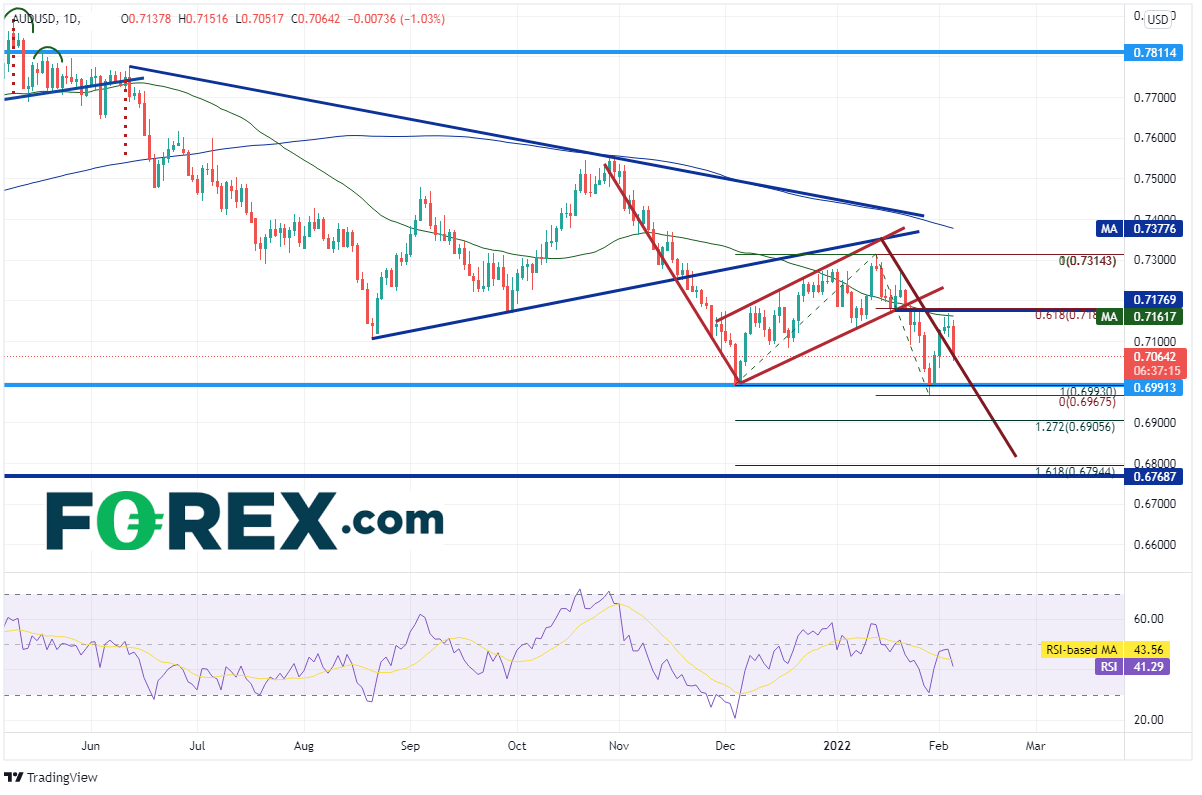 澳元/美元日图自2021年11月19日下破对称三角形以来不断走弱,考验2020年11月2日低点0.6990附近后反弹并测试对称三角形下轨趋势线所在的0.7314附近,最终形成旗形形态。澳元/美元在旗形最高点形成黄昏之星的看跌形态,随后开始下跌,于1月24日下破此形态并走向0.6800附近的目标。