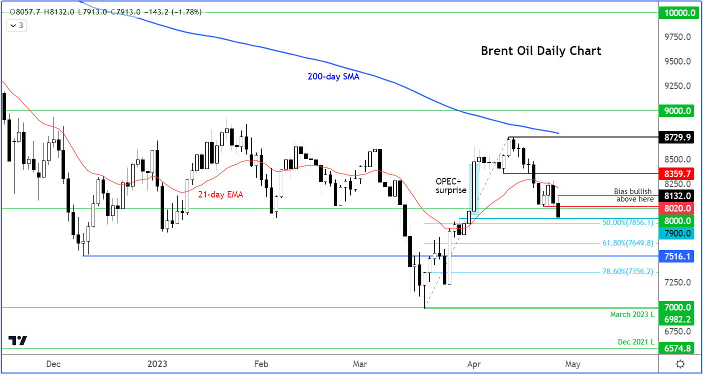 布伦特原油自3月底以来首次跌破80美元,而WTI原油也创下本月新低,76美元以下。两种石油合约也终于回补了本月初欧佩克+同意大幅削减石油产量后形成的缺口。随着补完缺口,石油能否卷土重来?我不会反向押注,即使对经济衰退的担忧正在上升。在等待技术反转信号确认的同时,我总体上是看涨原油前景的。