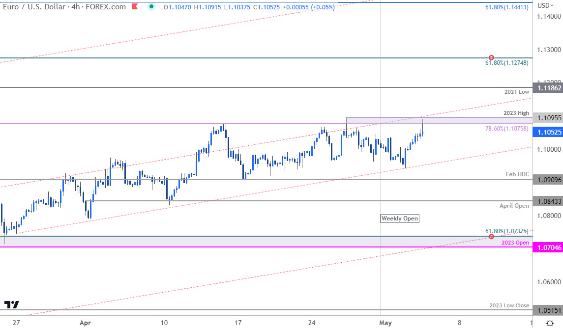注意:仔细观察欧元价格走势,欧元/美元继续试探上升趋势阻力线,同时自3月下旬的波段低点连线形成的其平行线托住了随后的每一次回调。沿着该斜线(目前~1.0960+)寻找第一支撑位,随后又是支撑位1.0909和4月开盘价1.0843。关键支撑/看涨研判点位落在1.0705/37——该区域由2022年上升趋势线、本年开盘价和3月反弹的61.8%回撤位共同构成。