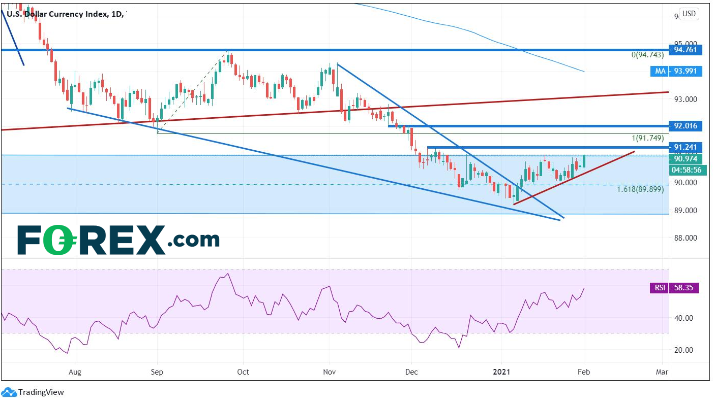 欧元/美元的走势很大程度上取决于美元。美元指数日图显示,价格打破了1月8日以来的下降楔形,到目前为止一直守住2020年9月1日低点到2020年9月25日高点行情的161.8%扩展位,也守住2018年1月以来的支撑区域89.00-91.00。美元指数似乎正在竭力站上91.00,如果站上91.24,可能清除摸至91.75和92.01的障碍,如果受阻于91,可能跌至90.50附近的趋势线支撑和90.05附近的水平支撑位。